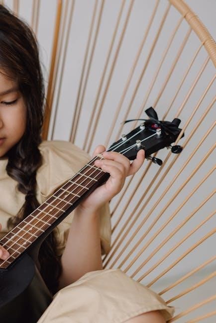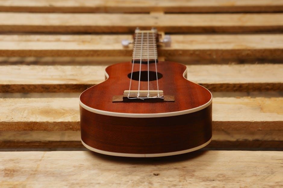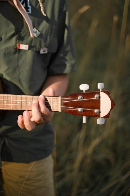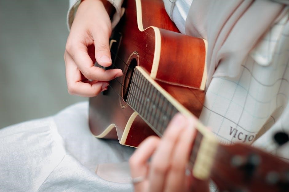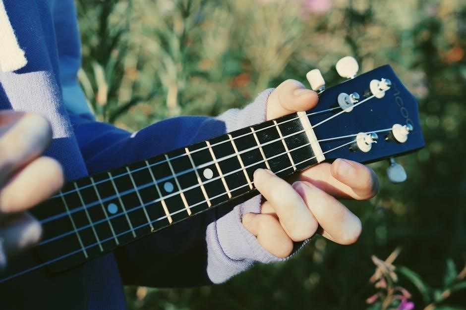 Strum all four strings – A‚ D‚ G‚ and E – to hear the full F Major chord. Consistent practice with a PDF guide will build dexterity and allow for smooth transitions between chords. Don’t be discouraged; persistence is key!